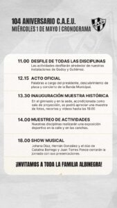 Uno de los colaboradores del Club, Germán Díaz, informó que mañana se realizan los festejos por los 104 años de la institución, pero se suman algunas propuestas pensadas para el centenario, que no se pudieron concretar por la pandemia. Dijo que será un día completo de festejos, comenzando con un desfile de todas las disciplinas en todas las categorías, desde las 11 horas; para continuar con un acto protocolar, la palabra del Presidente José Bravo y la actuación de la Banda Municipal. Habrá también una muestra de fotografías y recortes periodísticos en el interior del Club, y en la sede social se emitirán películas con notas de años atrás relacionadas con la institución. También se hará una muestra de todas las disciplinas en las calles Godoy y Gutierrez, que estarán cortadas al tránsito, en las canchas y en el interior del Club.