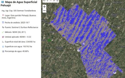Muestra un 35.24% del partido con agua en superficie y cuando se divide al este y oeste, este primero posee un 45.8% de la superficie afectada, versus un 24.6% más al oeste. Fuente Germán Torrallardona Ing. Agrónomo especialista en Teledeteccion y GIS