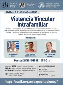 La Doctora Lucrecia Buffarini, organizadora de las Jornadas sobre violencia vincular intrafamiliar, anunció el cuarto encuentro que se llevará a cabo en los salones del Teatro Español el martes 2 de diciembre desde las 15 horas, con el objetivo de difundir y visibilizar una problemática que se genera en las familias que atraviesan un divorcio, donde en la mayoría de los casos, los menores quedan al medio como herramientas utilizadas por uno de los mayores para dañar al otro, ante una situación que no logran resolver; indicando que generalmente, la acción es ejercida por el adulto que convive con el niño.