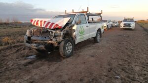 CPR Pehuajo, comunica que con fecha 01/07/24 entre las 07.30 y 8.00 hs. se recepciona llamado al abonado de emergencias de este Comando dando cuenta de un accidente en zona rural Cuartel II de este medio, mas precisamente en continuacion de calle Lopez y Planes. Arribado el personal de esta dependendencia constata que por mecanica que se trata de establecer, una camioneta marca Toyota modelo Hilux, de la Cooperativa Electrica Pehuajo, conducida por Tihista Pablo, colisiona a dos animales vacunos que se hallaban en la calle sin cuidador, produciendose roturas en el vehiculo y el deceso de uno de los vacunos. Se logra identificar al propietario labrandose actuaciones por infraccion al art. 112, 148 y 166 del Codigo Rural (ley 10081/83) con intervencion del Ministerio de Desarrollo Agrario. El conductor resulto a prima facie ileso, no requiriendo asistencia medica. Se prosiguen las actuaciones.