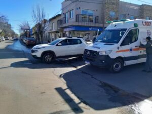 UNA CAMIONETA FIAT TORO BLANCA Y UNA MOTO COLISIONARON EN ESA ESQUINA. LAS DOS OCUPANTES DE LA MOTO, UNA MUJER Y UNA NIÑA, ERAN ASISTIDAS POR PERSONAL DE LA AMBULANCIA DEL HOSPITAL EN EL LUGAR DEL ACCIDENTE