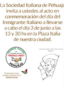 El Presidente de la Sociedad Italiana de nuestra ciudad, Luis Cúneo, hizo pública la invitación a la comunidad, al acto oficial por el día del inmigrante italiano que se realizará el lunes 3 de junio a las 13.30 horas en Plaza Italia. Indicó que se eligió ese día por el nacimiento del General Manuel Belgrano, cuyos padres fueron italianos; y anunció que la idea es realizar un acto protocolar sencillo, que incluirá la presentación del coro de la Sociedad Italiana, con el que vienen trabajando hace 3 meses.