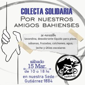 El Presidente de la Agrupación de motos Pehuajó, Rubén Fraile, informó que como es habitual, la entidad organiza acciones solidarias en beneficio de quienes necesitan. En ese sentido, expresó que no pueden estar ajenos a lo que sucedió en Bahía Blanca; ante esa situación, organizaron una colecta que comienza este sábado de 10 a 18 horas en la sede de la institución, y continuará toda la próxima semana, aunque también aprovecharán la presencia que habitualmente tienen en los festejos por el aniversario de Curarú, para extender la colecta en ese lugar.