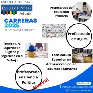 Con relación al nivel terciario, Cánepa recordó que el Instituto dicta tecnicaturas de 3 años de duración y profesorados, de 4 años, detallando que están abiertas las Tecnicaturas superiores en Higiene y seguridad en el trabajo, Administración de Recursos Humanos y Radiología desde 2º año; mientras que los Profesorados son de Educación primaria, Inglés, Ciencias políticas y Sordos e hipoacúsicos para quienes ya tengan formación previa en educación especial. Las clases comienzan el 17 de marzo, y hasta ese momento hay tiempo de inscribirse; y desde el Instituto reciben a alumnos interesados para explicarles sobre el alcance y el campo de acción de cada carrera.