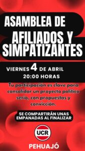La Presidente del Comité UCR Pehuajó, Sandra Martín, invitó a la comunidad a la asamblea que se realiza hoy, a las 20 horas, en el Comité local; un encuentro que estaba previsto para el mes anterior, pero debió suspenderse por cuestiones de agenda de los integrantes de la mesa, concejales y consejeros escolares. Explicó que las autoridades partidarias locales hicieron una selección de un grupo de personas que consideran idóneas para integrar la lista de candidatos de cara a las elecciones de este año, y serán presentadas ante los afiliados para que estos decidan el orden de aparición en la lista, netamente radical. De todos modos, Sandra Martín explicó que todo queda supeditado a las decisiones que se puedan tomar en Provincia, dentro del partido, con la definición de la Justicia sobre la elección; y fuera del partido, con los acuerdos a los que se pueda llegar con otras fuerzas políticas. “No hay nada definido todavía” dijo la Presidente de la UCR Pehuajó, pero insistió en que la intención de la Mesa es definir una lista de candidatos radicales que puedan representar los lineamientos del histórico partido, abriendo la participación a los socios y simpatizantes como corresponde.