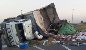 Un camión marca Volkswagen que se trasladaba con un acoplado cargado de bebidas gasificadas, volcó este miércoles. Producto del accidente, el chofer fue trasladado al hospital Miguel Capredoni en ambulancia y las botellas quedaron tiradas sobre cinta asfáltica. Posteriormente fueron retiradas junto con el camión por una máquina.