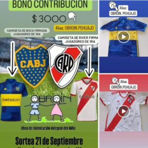 Una de las colaboradoras de OBROIN, Rosario Vergara, informó que gracias a la intervención de un vecino que siempre ayuda a la institución, se consiguieron dos camisetas, una de River y una de Boca, autografiadas por jugadores de primera división, con las que se organizaron dos bonos contribución por el valor de $3000. Los interesados deben comunicarse con cualquiera de los integrantes de la Comisión de OBROIN o al 15618151 y solicitar su bono, realizar la transferencia a la cuenta de alias OBROIN.PEHUAJO, y el 21 de septiembre se realizan dos sorteos. En la última jugada de quiniela de la Provincia, se sortea la camiseta de River; y en la última jugada de la quiniela Nacional, se sortea la de Boca.