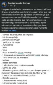 La familia organizó una rifa para reunir el dinero, y el sorteo será a fin de mes o cuando se vendan todos los números, que tienen un valor de $1500 y ya hay más de 20 premios donados por gente que colabora con la familia. Los interesados en adquirir la rifa pueden dirigirse a Cerro de la Caballada 257 o comunicarse al 2396 424183.