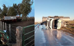 En la mañana de este viernes 20 siendo a las 08:20 de la mañana los servicios de emergencia fueron alertados de un accidente vial en ruta nacional 5, Km 284, a metros del denominado «Camino Fantasma», que por causas que se tratan de establecer, el conductor de un transporte de leche, pierde el control del mismo y se produce el vuelco del mismo ocupando parte de la cinta asfáltica.