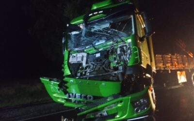 Pasando Madero. RUTA LIBERADA A LA HORA 22, precaución, ir despacio circulando y con balizas prendidas No hay lesionados. Tres personas en el camión que es de La Pampa, una de ellas femenina, el camión llevaba verduras y frutas, el micro es de Buenos Aires, Via Bariloche e iba de Retiro a Bariloche AMPLIAREMOS