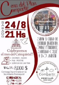 Una de las integrantes del Plan Compartir de la Parroquia San Anselmo, Graciela Paz, invitó a la comunidad a la cena mensual que tendrá lugar el sábado 24 de agosto en el Salón Parroquial, en el mes de María y celebrando el día del catequista y otras fechas especiales para la Iglesia durante el mes. Indicó que las tarjetas están en venta en la Secretaría Parroquial, de lunes a sábados de 10 a 12 y de 17 a 19 horas, y los sábados de 10 a 12 horas. La cena contará con la actuación de Hernán Luguercho y Agustín Dj, para bailar,