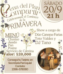 La integrante del Plan Compartir de la Parroquia San Anselmo, Graciela Paz, recordó que este sábado se realiza la cena mensual en la que celebrarán la llegada de la primavera, aunque también habrá festejos por el día del profesor, el psicopedagogo y el jubilado. Dijo que como cada año, eligen Miss y Míster primavera, y habrá espectáculos a cargo de Dúo Cánepa Farías, Toto Valdéz y Dj Tano. Aún quedan tarjetas disponibles en la Secretaría de la Parroquia.