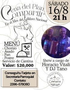 Una de las integrantes del Plan Compartir de la Parroquia San Anselmo, Graciela Paz, recordó que este sábado se realiza la cena mensual en el Salón Parroquial, y será en adhesión al mes del folklore que se celebró en julio en todo el país. Las tarjetas están en venta en la Secretaría, de martes a sábados de 10 a 12 horas, y los asistentes deberán llevar vajilla completa, ensalada y bebidas, o pueden comprar en la cantina que funciona en el lugar.