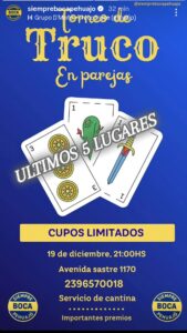 El año no termina ahí, porque después de la primera juntada de truco que realizaron días atrás con mucho éxito, la gente empezó a pedir otra, porque muchos no pudieron estar presentes por otros compromisos típicos de este mes, y la comisión respondió en consecuencia. El viernes a las 21 horas se realiza un nuevo encuentro de truco en parejas, para que el que quedan algunos cupos disponibles. Garrote recordó que en cada evento que se hace en la sede, se recibe a la gente que quiere conocer el trabajo, sumarse a las actividades o asociarse a la Agrupación, por lo que invitó a los interesados a acercarse.