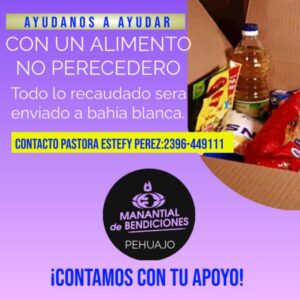 Una de las integrantes de la Iglesia Evangélica “Ministerio Manantial de bendiciones”, Estefanía Pérez, informó que iniciaron una colecta de alimentos no perecederos, artículos de limpieza e higiene personal, teniendo en cuenta que son muchos los grupos que están donando ropa. Las donaciones se llevarán el jueves por la noche directamente a las Iglesias con las que establecieron contacto. Los interesados en colaborar pueden acercar sus donaciones a la sede de la Iglesia, en Adolfo Mitre 50.