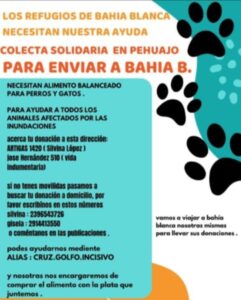La comerciante local, Gisela Valdéz, contó que luego de ver las acciones solidarias que se replicaban en medios de comunicación y redes sociales en beneficio de las personas afectadas por el temporal, decidió junto a su amiga, Silvina López, impulsar una campaña en beneficio de los animales, que tuvo repercusión inmediata. La idea es recolectar alimento para perros y gatos, bozales, correas y elementos de higiene para los animales que están siendo rescatados en los refugios de bahía Blanca y Cerri.