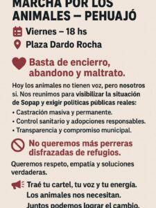 Belén Barragán, vecina de nuestra ciudad y proteccionista de animales, informó que a través de las redes sociales surgió la convocatoria a una marcha en defensa de “los sin voz” como le llaman a los perros, especialmente por las últimas situaciones que se fueron dando a conocer relacionadas con el trabajo que viene haciendo Pehuaellitas. Dijo que la realidad es que están levantando, recolectando o secuestrando perros, pero de ninguna manera se puede hablar de rescate, ya que los llevan a SOPAP y ahí quedan, sufriendo enfermedades, peleas y hasta la muerte. Señaló que hace unos días se conoció el caso de una perra que murió atacada por otros tres perros mientras el personal estaba en el refugio; hay muchos perros con dueños que levantan siendo que están chipeados y castrados por el programa; y destacó el caso de una persona a la que le llevaron un perro y cuando lo devolvieron murió, contagiando a los otros tres perros de la casa que también fallecieron, pero los dueños no quisieron denunciar.