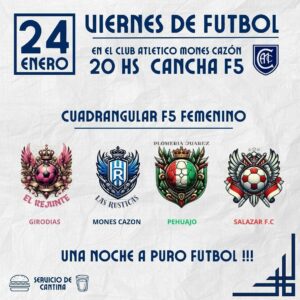 El Presidente del Club Atlético Mones Cazón, Hugo Capovila, informó que el viernes se realiza un cuadrangular de fútbol 5 femenino en las instalaciones del Club, en las que trabajaron mucho y están en excelentes condiciones; destacando que se enfrentarán equipos de Girondo, Salazar, Pehuajó y Mones Cazón, con la actividad coordinada por Laura López, y un esmerado servicio de cantina en el que ya se trabaja. Dijo que la idea es generar actividades alternativas durante el verano, que permitan recaudar fondos para solventar los gastos de participación del torneo durante el año.