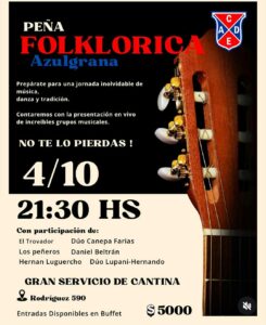 El Presidente del Club Defensores, Ezequiel Payero, anunció que el 4 de octubre se realizará la Peña Folklórica Azulgrana en la institución desde las 21 horas, respondiendo a un pedido de la gente y buscando alternativas para generar fondos que permitan cubrir los gastos de funcionamiento de la institución. Celebró que inmediatamente se tomó la decisión de realizar el evento, los artistas se unieron para colaborar, y hay una grilla maravillosa de artistas que compartirán esta primera noche. Los peñeros, El trovador, Dúo Cánepa Farías, Luguercho, Beltrán y el dúo Lupani Hernando, serán parte de los artistas presenten en una noche, que contará con un excelente servicio de cantina. Las entradas tienen un valor simbólico de $5000 y se pondrán en venta hacia fines de esta semana o principios de la próxima en el bufet del Club.