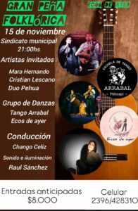 Marianela Hernando, integrante del ballet Ecos de ayer, confirmó la realización de la primera peña que organiza el grupo este sábado desde las 21 horas en el Sindicato de Trabajadores Municipales. Indicó que la respuesta del público fue muy buena en la venta de entradas anticipadas, e informó que ahora solo se venden en puerta, a $10 mil mayores y $5 mil menores.