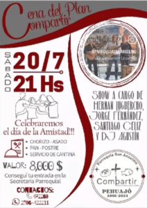Una de las integrantes del Plan Compartir de la Parroquia San Anselmo, Graciela Paz, invitó a la comunidad a celebrar el día de la amistad el próximo sábado, en la cena mensual, que contará con la actuación de Hernán Luguercho, Jorge Fernandez, Santiago Celis y Dj Agustín, con música para bailar. Indicó que el salón es calefaccionado y la tarjeta para la cena show tiene un valor de $8000, que se puede adquirir en la Secretaría Parroquial, de lunes a sábado de 10 a 12 horas, y de lunes a viernes de 17 a 19.