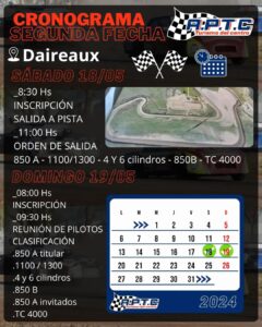El Presidente de la APTC, Hugo Vicente, informó que está todo listo para la fecha que se corre este fin de semana en Daireaux, y anunció que la actividad comienza mañana a las 8.30 horas con la inscripción de pilotos y pruebas libres a las 11 horas, mientras que el domingo comienzan a las 8 horas con inscripción, reunión de pilotos, clasificaciones y finales, con la particularidad de que se corre “La hora”.