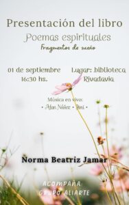 Norma Jamar informó que hace mucho tiempo escribe poemas, y esta es la primera vez que presentará un libro, acompañada por el Grupo AliArte. Será en la Biblioteca Rivadavia el domingo a las 16.30 horas, y estará acompañada por los músicos Alan Núñez y Jimi, en una propuesta para compartir un buen momento de lecturas y reflexiones.