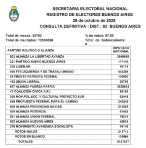 El escrutinio definitivo que realizó la Justicia Electoral confirmó la victoria de La Libertad Avanza sobre el peronismo de Fuerza Patria en la categoría diputados nacionales por la provincia de Buenos Aires por una diferencia de menos de 30 mil votos.