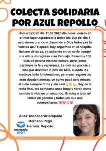 Carlos Repollo agradeció a familiares, amigos y hasta desconocidos que se hicieron eco de esta situación y nos acompañan dese la oración, desde las energías, pero también desde lo económico ya que la estadía de los familiares para acompañar a Azul conlleva un costo de alrededor de $900 mil por mes. “Somos gente de trabajo, yo soy policía retirado y trabajé en una remisera, porque algunos decían que tengo una flota de remises y no es así” dijo, e indicó que organizan rifas y tienen un alias disponible para quienes quieran ayudarlos.