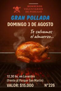 El Presidente de la institución, Raúl Brisoliz, informó que está confirmada la gran pollada que realizarán este domingo, con una gran cantidad de tarjetas ya vendidas. Dijo que hay tarjetas aún disponibles en el Cuartel, y como es habitual, preparan algunos pollos extra para quienes no hacen la reserva anticipada y pasan a comprar a último momento. El valor de la tarjeta es de $15 mil, y el retiro será el domingo desde las 12.30 horas en el predio de calle Lavardén, frente al Parque General San Martín.
