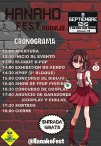 Una de las integrantes de la organización del evento, Melisa Spinelli, invitó a la comunidad a participar de la Hanako Fest en su primera edición en nuestra ciudad. Será el domingo 8 de 12 a 18 horas en Casa tomada, y habrá exposición de muchos emprendimientos, exhibición de Kendo, show de Fede Piñeiro, concurso de cosplay y sorteos.