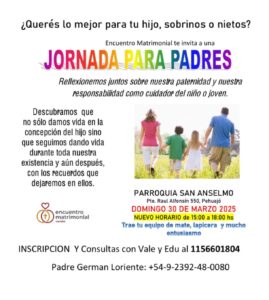 Finalmente, recomendó confirmar presencia previamente en la Secretaría de la Parroquia, para una mejor organización, y anticipó que si el resultado es positivo, habrá una nueva jornada sobre matrimonio, abordando los tres ejes más complejos de la relación: hijos, manejo del dinero y sexualidad.