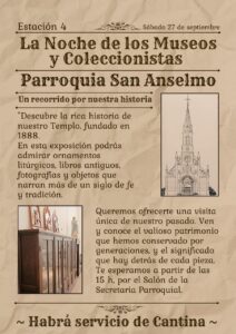 Una de las integrantes del Plan Compartir de la Parroquia San Anselmo, Graciela Paz, informó que los organizadores de La noche de los Museos y Coleccionistas convocaron nuevamente a la institución a participar, por lo que habrá una muestra de la historia de la Iglesia; pero también les brindaron la oportunidad de brindar servicio de cantina exclusivo. En ese sentido, anunció que habrá cosas dulces para el mate por la tarde, mientras que después pondrán en venta bebidas, choripanes, hamburguesas, super panchos y conos de papas fritas a muy bajos precios, con el objetivo de seguir recaudando fondos para solventar los gastos de mantenimiento del edificio.