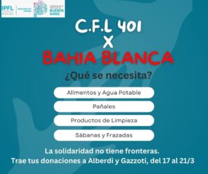 La Directora del Centro de Formación Laboral 401, Mónica Gómez, informó que viendo la situación que viven los vecinos de Bahía Blanca, decidieron organizar una colecta a través de los Centros de Formación de Bahía, para colaborar con las familias que más necesitan. La idea fue comunicada al Coordinador de Centros de la Región XV, y se replicará en todos los Distritos para luego trasladar lo recaudado en forma conjunta.