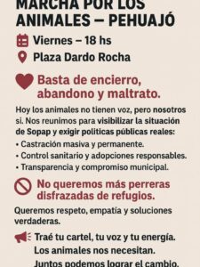 ColaboracionesInstitucionalMarcha por los animales Pehuajó, este viernes a las 18 horas en la Plaza Dardo Rocha Tito Fitante2 semanas atrás2 semanas atrás00 min minutos Navegación de entradas Anterior: SUBDDI BOLIVAR – IDENTIFICAN AL AUTOR DEL HECHO Y RECUPERAN HERRAMIENTAS SUSTRAIDASSiguiente: CONFERENCIA DE PRENSA: MULTISECTORIAL PEHUAJÓ Deja una respuesta Cancelar la respuestaTu dirección de correo electrónico no será publicada. Los campos obligatorios están marcados con *Comentario * Nombre * Correo electrónico * Web