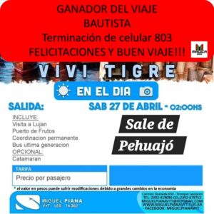 La coordinadora de empresa Miguel Piana viajes y turismo, Magdalena Rispal, regaló hoy un viaje a Tigre para los oyentes de Radio Mágica que participaron durante tres días del concurso. Con una inscripción de 96 participantes, el ganador fue Bautistas, con terminación de celular 803, con el número 21 que eligió Lucas Piana, coordinador de la empresa. “hicimos un balance en estos días y esos son los viajes que vamos haciendo en lo que va del año” dijo, para felicitar al ganador y a la vendedora, que “está haciendo un trabajo excelente en Pehuajó” dijo, y repasó toda la oferta de viajes que tienen para los próximos días, haciendo hincapié en las salidas del mes de junio, que incluyen fiestas y brindis por el aniversario 14 de la empresa.