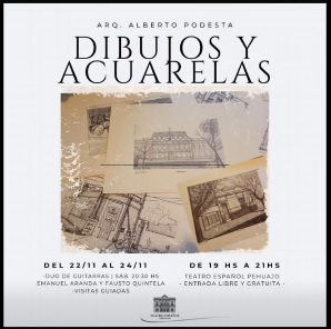 El Arquitecto pehuajense, Alberto Podestá, informó que fue invitado por la Comisión del Teatro Español, para realizar una muestra de dibujos y acuarelas de su autoría en un evento que se realiza este fin de semana, con lo que seleccionó una veintena de obras que denominó “Imágenes de Pehuajó”. Contó que se trata de trabajos realizados hace mucho tiempo y otros más actuales, de los cuales planea hacer ´replicas para vender a beneficio del Teatro, destacado la tarea enorme que realiza la Comisión para recuperar el edificio. Dijo además que habrá visitas guiadas, para que la gente pueda conocer aspectos del edificio que habitualmente el público no ve; y habrá además un espectáculo musical para disfrutar.