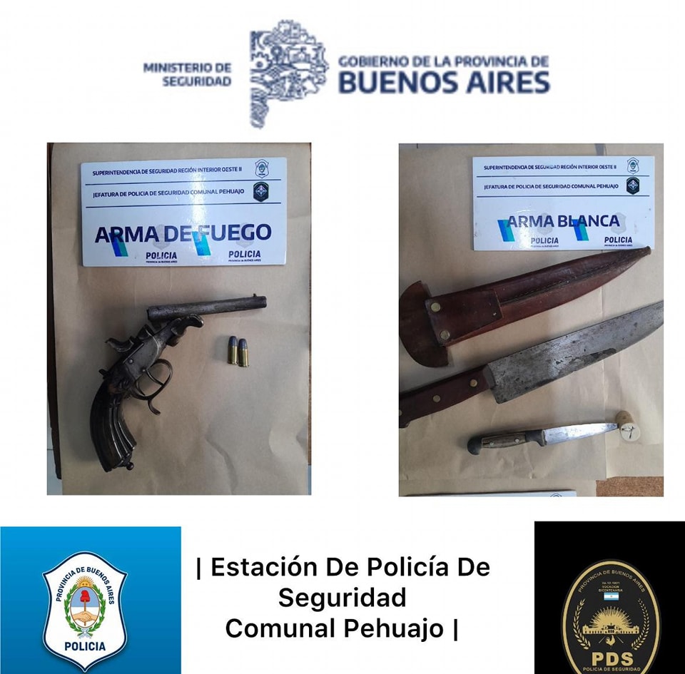 En el domicilio, se incautaron en la urgencia un pistolón, calibre 38, con municiones, y dos cuchillos, para con causante se estableció que resulta ser oriundo de la localidad vecina de Daireaux, mismo fue puesto a disposición de la fiscalía Nro. 7 a cargo del Dr. Caldentey Luis, quien en la fecha resolverá su situación procesal. –