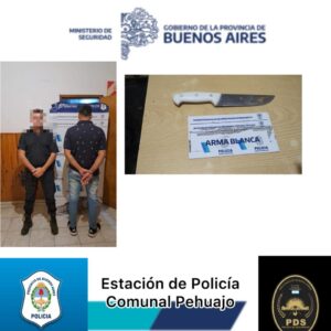 Con fecha 20 de Enero de 2025, personal de la Estación de Policía Comunal raíz llamado 911 emergencias, se comisiono a un domicilio de esta ciudad, donde una femenina solicitaba la presencia policial razón a que estaba siendo amenazada por su pareja, ante el rápido accionar por parte de los agentes intervinientes, se procedió en el lugar a la aprehensión inmediata del agresor tratándose un masculino de 26 años de edad, oriundo de este medio, a quien se le incauto entre prendas una cuchilla tipo carnicero con la cual amenazo a victima.- causante fue alojado en dependencia policial, donde una vez indagado por la Fiscalía Descentralizada nro. 7 de Pehuajo, recupero su libertad.-