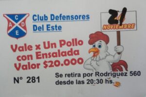 El Presidente del Club Defensores, Ezequiel Payero, informó que por primera vez desde que inició su gestión, organizan una gran pollada a beneficio de la institución. Aseguró que son tiempos complicados en lo económico y toda ayuda es bienvenida, y agradeció a la gente que siempre responde y colabora. Indicó que la tarjeta tiene un valor de $20 mil, para la compra de un pollo entero con ensalada, que se entregará mañana desde las 20.30 horas en la sede de calle Rodríguez 580.