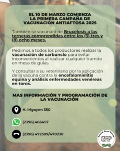 Crespo informó que la publicidad de la campaña se aprovecha para informar de la importancia de consultar con los veterinarios sobre otras vacunas como carbunclo, encefalomielitis y venéreas del toro, mientras que desde la institución, se incorpora con la de aftosa, la vacuna de brucelosis.