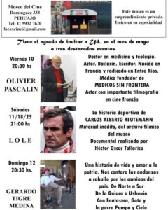 El propietario del Museo del Cine Pehuajó, Héctor Tallarico, anunció el variado programa de actividades que se desarrollará este fin de semana, y que comienza hoy a las 20.30 horas con la presencia de una personalidad destacada en diversas áreas, como es el señor Olivier Pascalin, actor de varias películas, doble de riesgo de actores reconocidos, bailarín de amplia trayectoria, integrante de Médicos sin fronteras, que habla 7 idiomas; quien puede brindar un riquísimo contenido cultural, y se presenta con entrada libre y gratuita.