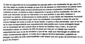 Un grupo de trabajadores municipales de la Guardia de Prevención Ciudadana acercaron a nuestra mesa de trabajo una nota para dar a conocer la situación que están atravesando, donde les exigen la renuncia a fin de mes por no haber intervenido en una gresca callejera entre varios jóvenes.