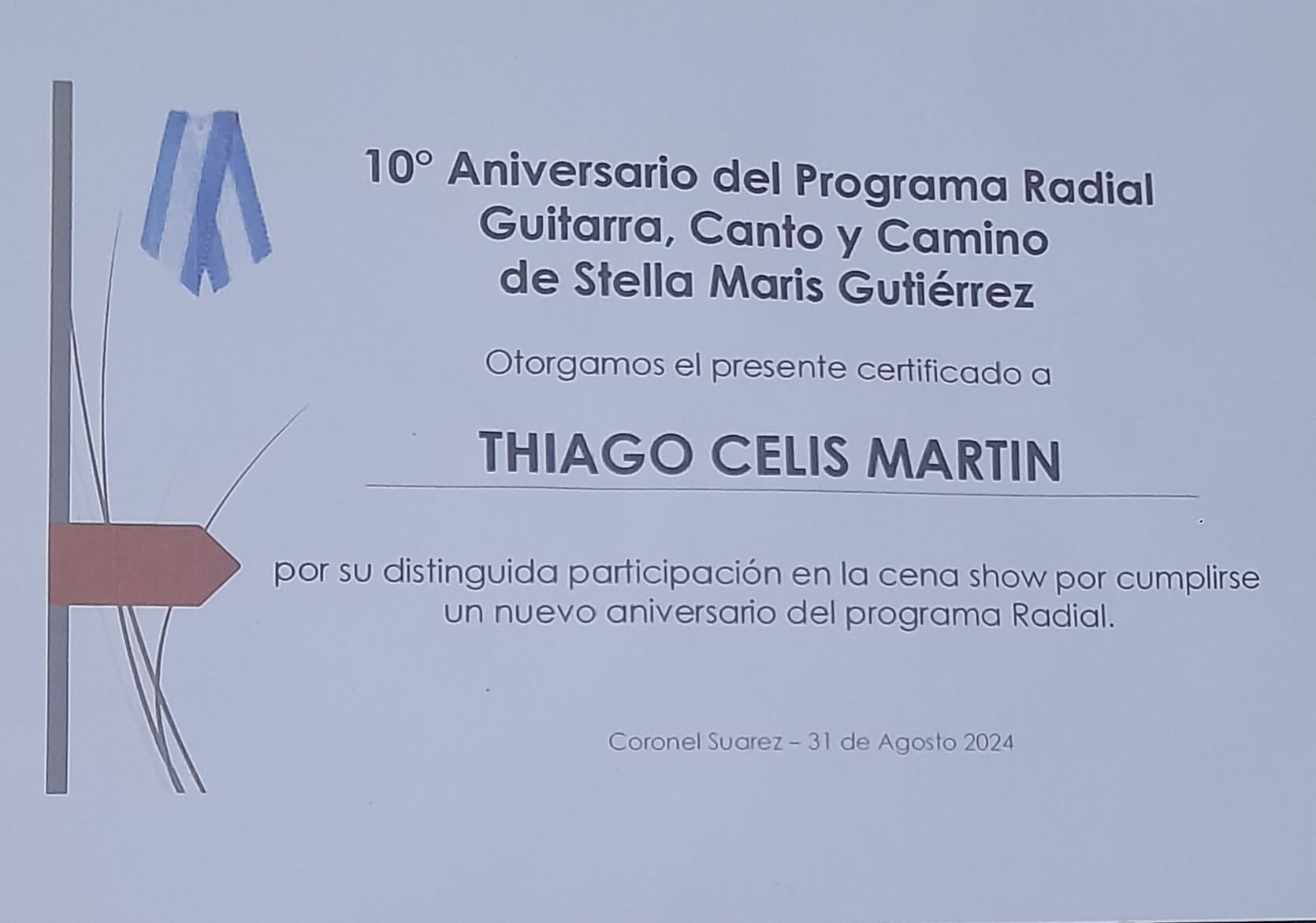 Santiago Celis, padre de Thiago, contó que hace año y medio atrás participó de la Peña Don Aurelio en San José, Partido de Coronel Suarez, convocado por los organizadores que habían visto una actuación en Huanguelén, y allí surgió una linda amistad. Hace unos días, lo llamó una locutora del pueblo que celebraba los 10 años de su FM con una gran peña, en la que actuaban varios artistas locales y el número central era Karen Arranz. Thiago iba a recibir un reconocimiento, no estaba en la grilla, pero terminaron pidiéndole que actúe y todo terminó con enorme emoción, “nunca vi a Thiago llorar después de tocar una zamba, y fue increíble ver a Karen Arranz también emocionada hasta las lágrimas” aseguró el padre del artista, para señalar que esto ocurrió a 240 kilómetros de Pehuajó, mientras que en su ciudad natal, no hay reconocimientos no convocatorias.