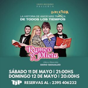 El autor de la obra, Darío Basualdo, confirmó las dos últimas funciones en Pehuajó, de una obra para reírse de principio a fin. Rumeo y Jolieta cuenta el momento en que el Grupo Arlequino, dedicado a la comedia, pretende cambiar de género y representar el clásico de Shakespeare, hasta que se dan cuanta que son muchos personajes y que la obra transita por varios lugares, pero deciden afrontar el desafío de todos modos con solo 4 actores. Divertida, disparatada y muy entretenida, la obra empieza con una reconocida voz que recomienda al público retirarse de la sala antes de que comience la presentación; es una obra para toda la familia, ya se presentó el fin de semana anterior a sala llena, y se presenta en dos últimas funciones este sábado a las 21 y el domingo a las 20 horas en la sala del TIP.
