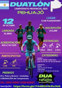 Uno de los integrantes de la Asociación Atletas Unidos de Pehuajó, Daniel Beltrán, confirmó que este fin de semana se corre la última fecha del Campeonato Provincial de Duatlón que viene siendo un éxito por la cantidad de participantes que se fueron sumando en cada fecha. Destacó que fue un desafío enorme la organización del único campeonato con estas características, ya que otros son solamente de 3 fecha y en ciudades cercanas, mientras que este constaba de 7 fechas que se corrieron en Nueve de Julio, Bragado, Los toldos, Chacabuco, Beruti, Carlos Casares y Pehuajó.