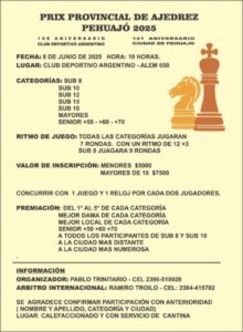 Uno de los referentes del ajedrez en Pehuajó, Roberto Villabrille, anunció la realización del Prix Provincial anual para este domingo en el Club Deportivo de nuestra ciudad, donde se esperan más de 200 ajedrecistas de Azul, Olavarría, Nueve de Julio, Junín, 25 de mayo, Las flores y otras ciudades. Destacó además la participación de pehuajenses en todas las categorías, ya que hay un intenso trabajo en las escuelas que funcionan en la Municipalidad, Colegio Santa María, Centro de Estudiantes de la Escuela Normal y la Biblioteca Rivadavia. Dijo que se juega desde sub 8 a senior 70, y que la actividad dará inicio a las 10 horas, en el gimnasio del Club Deportivo con entrada por calle Alem.