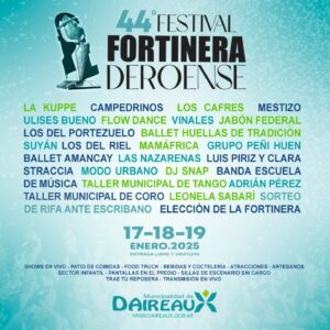 En la edición número 44, la Fortinera tendrá un viernes a puro folklore, con el cierre a cargo de Los campedrinos; Mestizo, que viene del norte; Los del portezuelo; Los del riel, de Olavarría que iban a actuar en la fieste del cordero que se suspendió por lluvia; la Banda escuela de música. E sábado cierra la noche La kuppé, y estarán presentes Los cafres, reggae, tango, escuelas de danzas folklóricas tradicionales y de danzas urbanas que han ganado importantes premios el año anterior. Y el domingo, cierra Ulises Bueno; Vinales; Suyán de Daireaux; Adrián Pérez, Director de la Orquesta escuela con su propia banda; Peñi wen y Las nazarenas; elección de la reina y sorteo de la rifa.