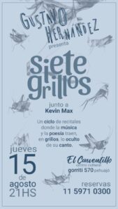 Gustavo Hernandez, responsable del ciclo cultural Siete grillos, recordó que como parte de la organización, a esta altura del año se invita a artista que ya han participado del ciclo, que además, propone interpretar canciones que no son habituales en su repertorio. En esta oportunidad, el invitado es Kevin Max, con quien compartió una noche de boleros y una de comedia musical, y en esta oportunidad, trae un repertorio de tangos pero de los que no interpreta normalmente. La idea es repasar tangos de los años 40 y principio de los 50 que tienen como temática en común la ciudad, por lo que el aporte de Gustavo será justamente con canciones de la ciudad, pero de diferentes géneros.
