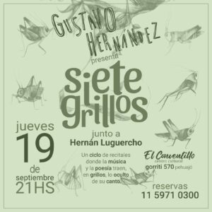 Gustavo Hernandez, creado de Siete grillos, anunció la edición de hoy con la participación de Hernán Luguercho, que presenta un repertorio de folklore diferente al que hace habitualmente en las peñas, acompañado por el piano de Gustavo Hernandez, quien además suma una propuesta de canciones de folklore a pedido del público. El evento será como siempre en El conventillo, Gorriti 576 desde las 21 horas; se recomienda llegar antes para hacer los pedidos gastronómicos y organizar todo para cuando empieza el show.